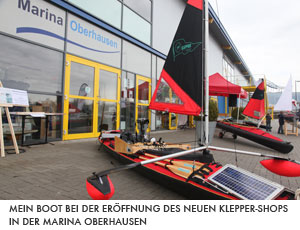 Am 19. und 20. März hat dann der neue Klepper-Shop in der Marina Oberhausen aufgemacht. Bei der Eröffnung wurde mein Boot mit der Expeditionsausrüstung ausgestellt