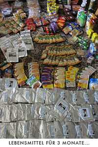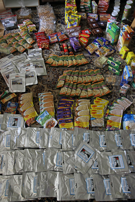 Der Dörrapparat läuft diesen Monat fast ununterbrochen, um Fleisch, Kartoffeln und andere Lebensmittel zu trocknen (Foto "Fleisch trocknen" siehe weiter unten, bei Januar 2010). Auch bei der Ausstellung läuft er täglich, leider etwas abseits, da ein Stromkabel zu meinem Lager gestört hätte. Auf dem Foto rechts seht Ihr eine Auswahl der Lebensmittel für die Tour... und das ist nicht einmal alles - mehr passte nur einfach nicht auf's Bild.